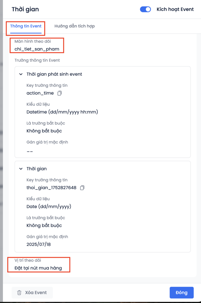 eventKey(bắt buộc): Key của event đã được tạo trên Mobio CDP. Mỗi event khi khởi tạo trên Mobio có một eventkey duy nhất.- Kiểu dữ liệu: String