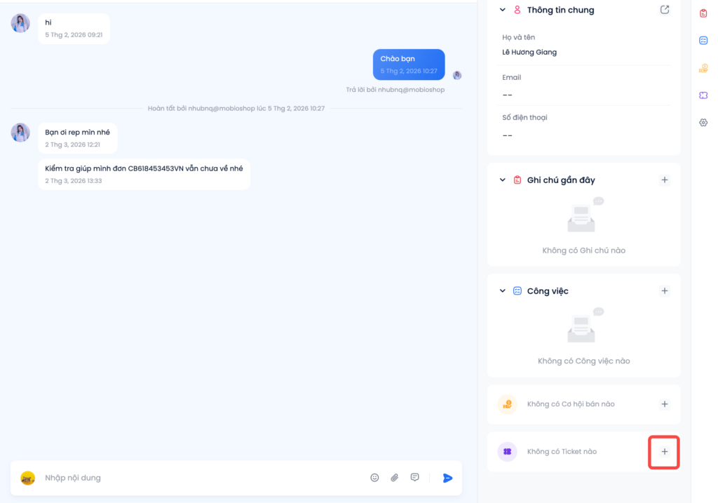 - Cách 2: Tạo ticket trên giao diện Online & Mạng xã hội → Chat và trả lời khách hàng