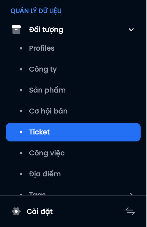 Truy cập vào Cài đặt, chọn Đối tượng → Ticket để mở cấu hình cài đặt Trường tùy biến Ticket