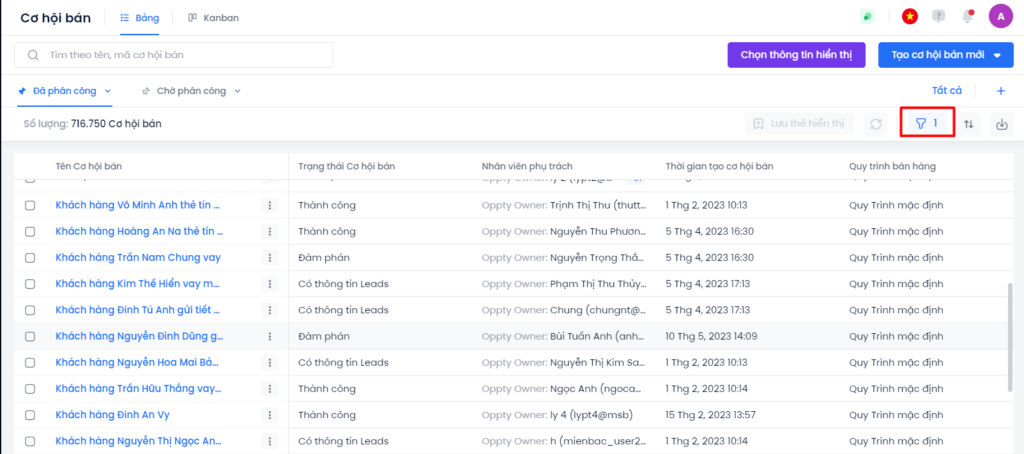 Bước 1: Click icon Bộ lọc trên giao diện danh sách Cơ hội bán.