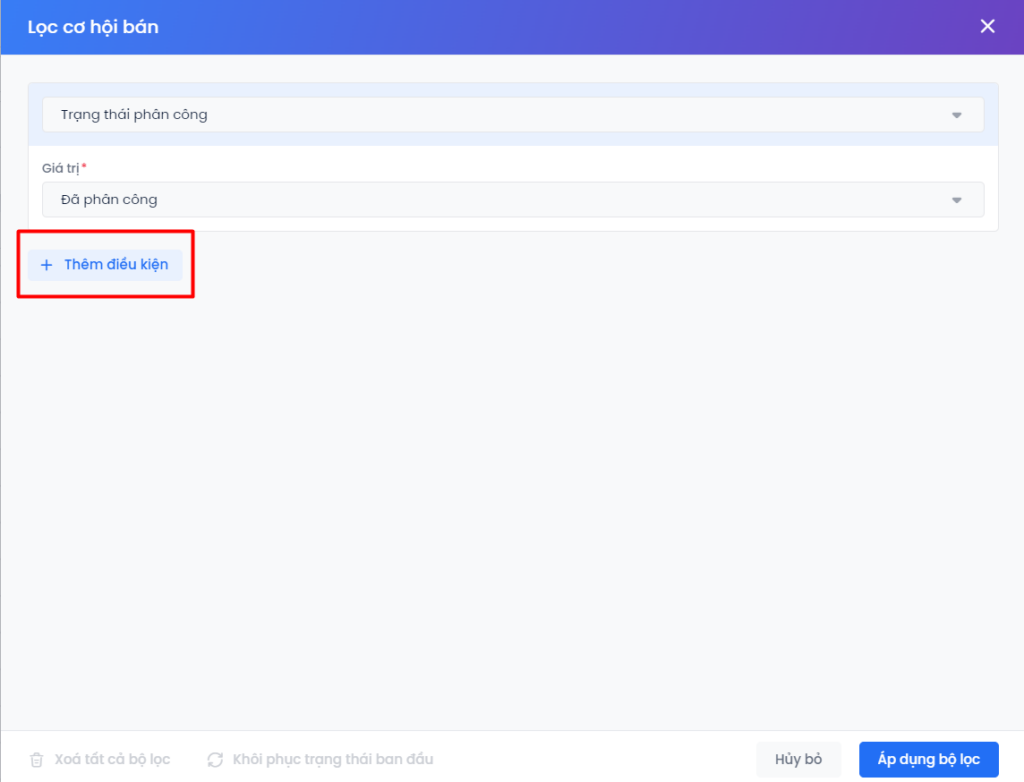 Bước 2: Chọn “Thêm điều kiện” để cấu hình các điều kiện tìm kiếm. Người dùng có thể tiếp tục chọn “Thêm điều kiện” nếu muốn áp dụng kết hợp đa bộ lọc.