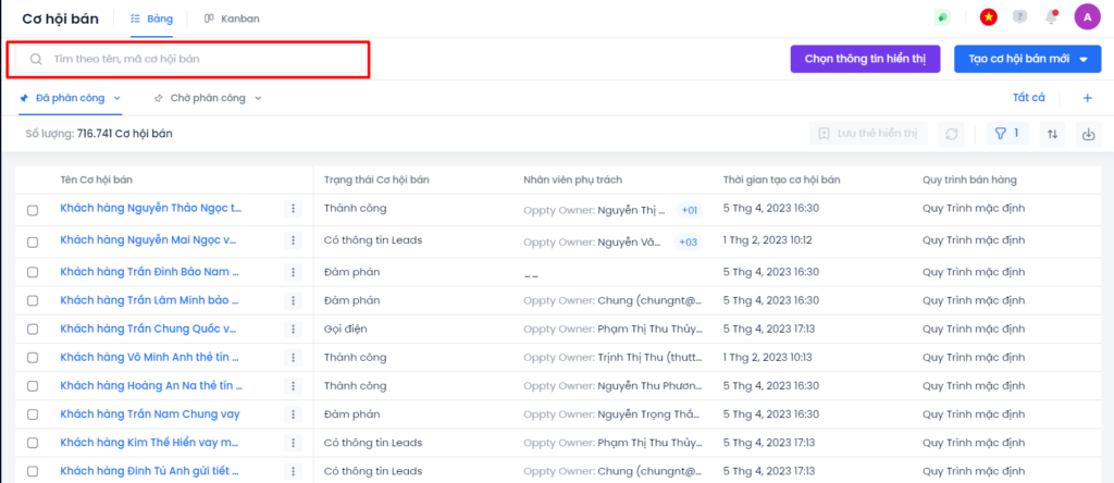 - Giao diện hiển thị mặc định khi truy cập và menu Cơ hội bán sẽ là thẻ Đã phân công và Chờ phân công.