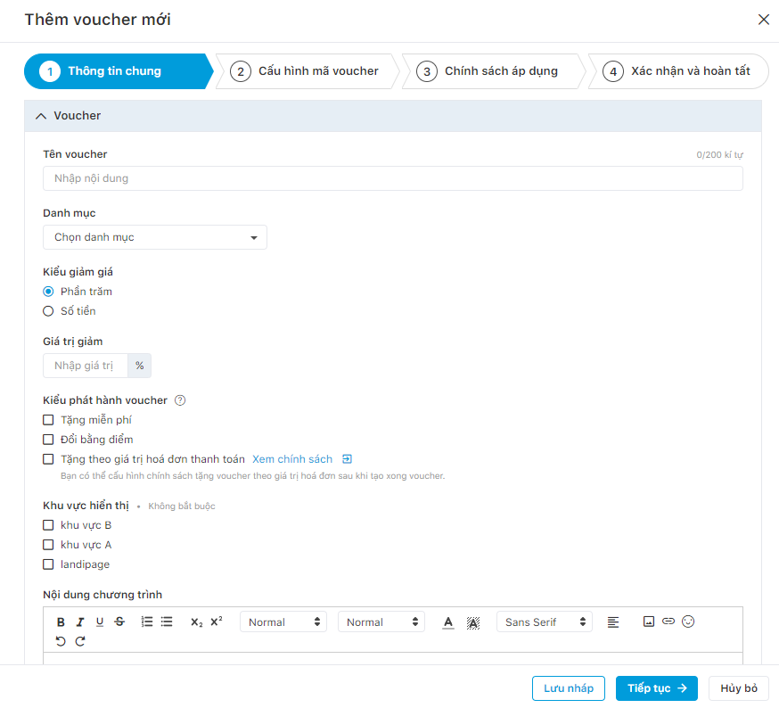 - Điền các trường thông tin: Tên voucher, danh mục, kiểu giảm giá, giá trị giảm, kiểu phát hành voucher, khu vực hiển thị, nội dung chương trình, tag hành vi, upload ảnh đại diện, ảnh mô tả.