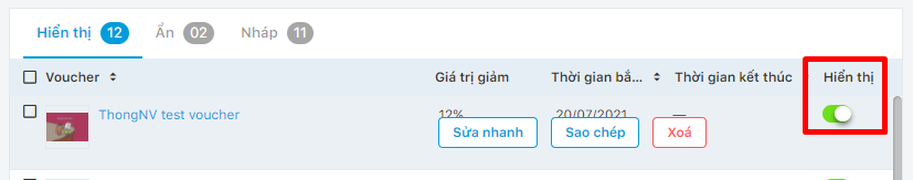 Tắt nút switch Hiển thị để voucher được đưa vào danh sách Tab Ẩn.