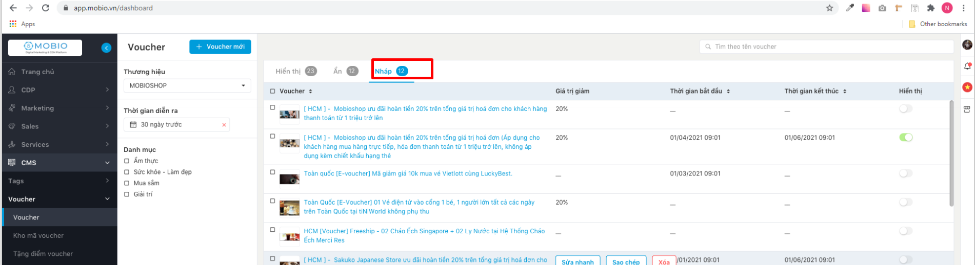 Ngoài ra, người dùng có thể vào tab Nháp để xem danh sách voucher đã được lưu nháp.