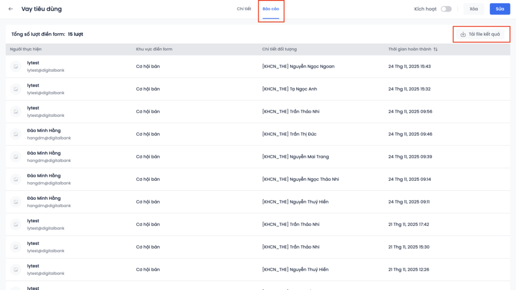 • Màn hình hiển thị báo cáo lượt điền form bao gồm Người thực hiện, Khu vực điền form, Chi tiết đối tượng, thời gian hoàn thành